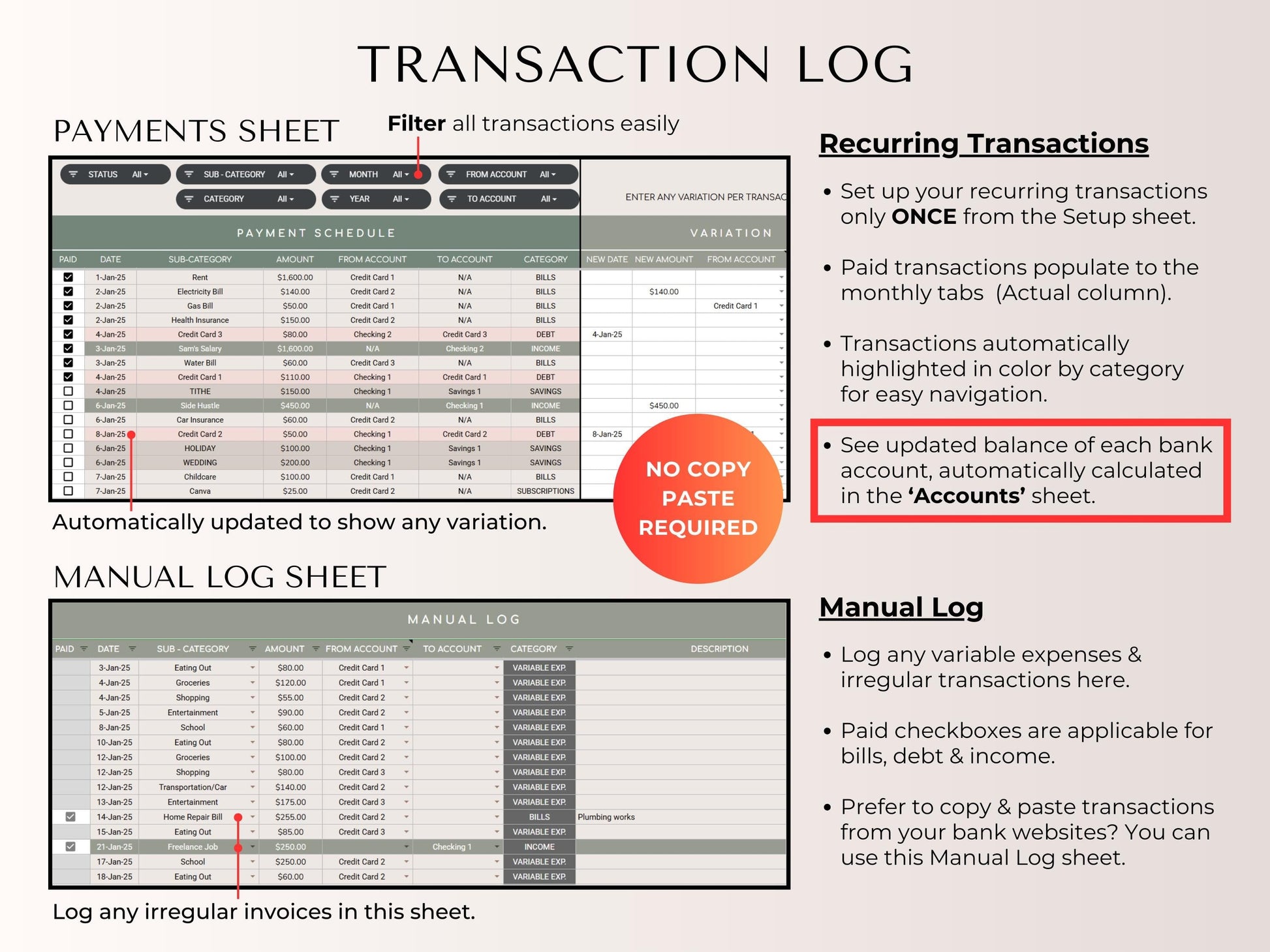 - Got an unexpected expense? Manual log handles it instantly