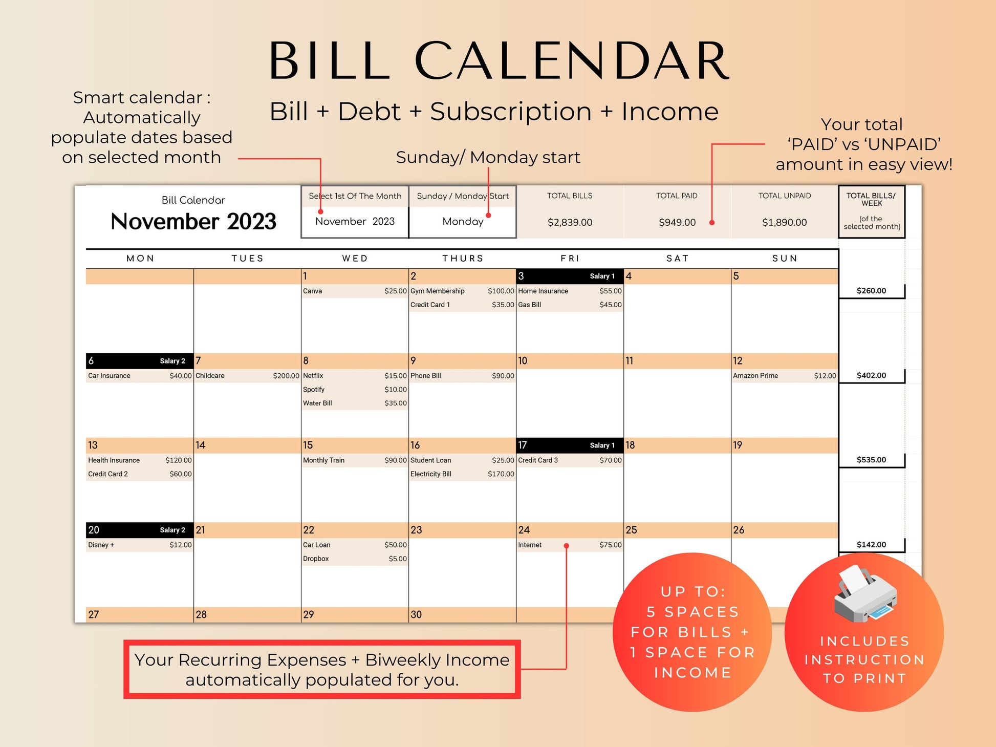 ✓ Smart Bill Calendar - Auto populate bills + debt + subscriptions + biweekly income