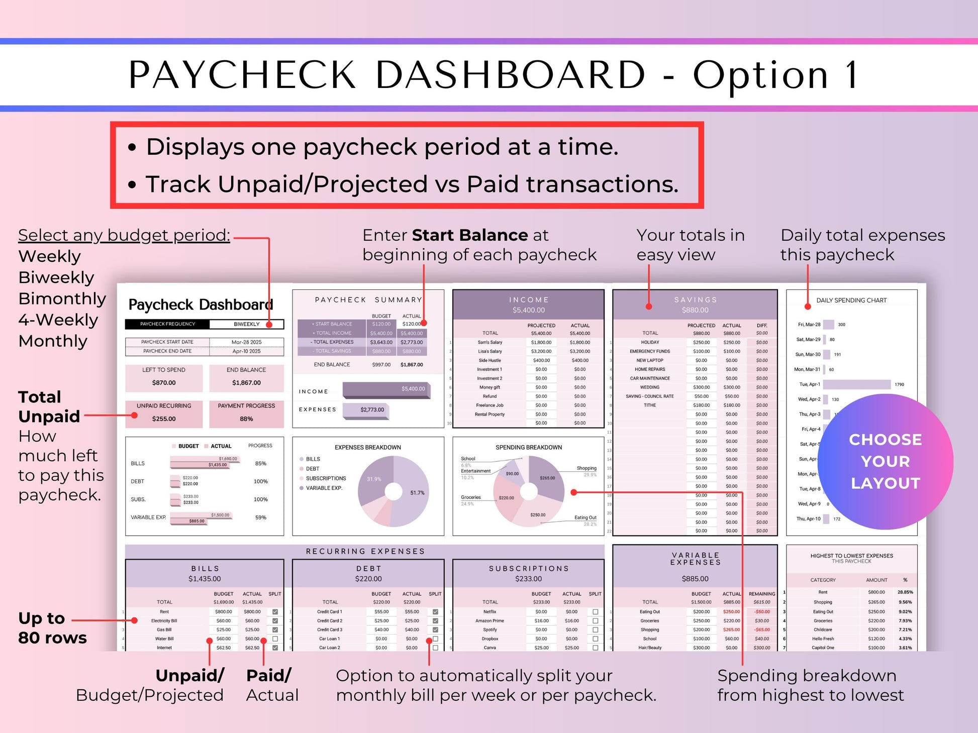Budget By Paycheck 2.0 Google Sheets Spreadsheet Template - Purple